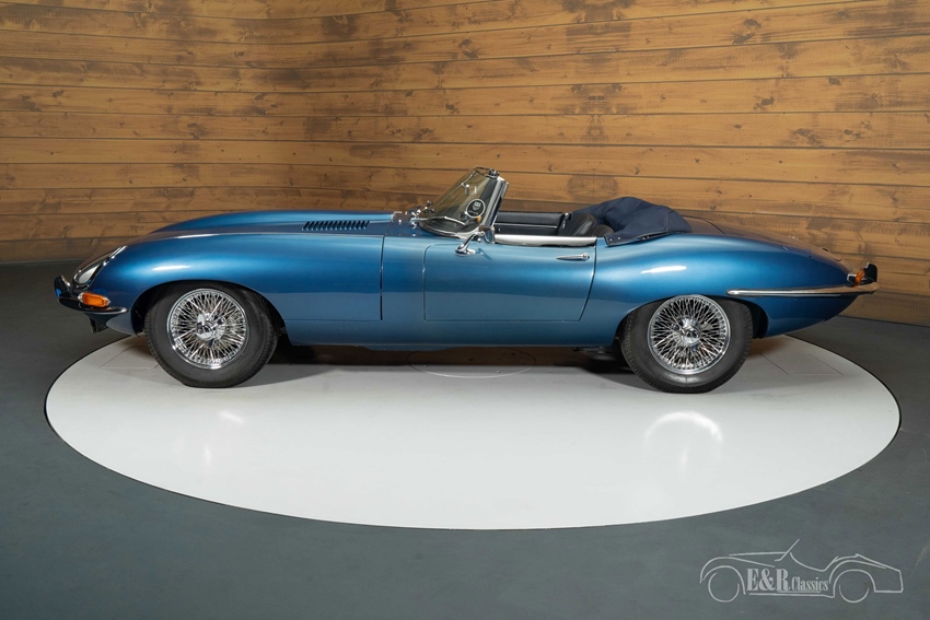 Jaguar E-Type Serie 1 3.8 OTS in Flag Blue Metallic te koop Ook qua uitstraling is deze Jaguar een lust voor het oog. De zeldzame Flag Blue Metallic lak combineert prachtig met de donkerblauwe soft top, het donkerblauw lederen interieur en de glanzende chromen spaakwielen. Het interieur ademt Britse klasse met het houten stuur, klassieke meters en een tijdloze sportieve uitstraling. De harmonie tussen exterieur en interieur onderstreept de exclusiviteit van deze E-Type, die een van de mooiste kleurencombinaties biedt die op dit model te vinden is. Een unieke kans om een van de meest begeerde klassiekers uit de autogeschiedenis te bezitten.