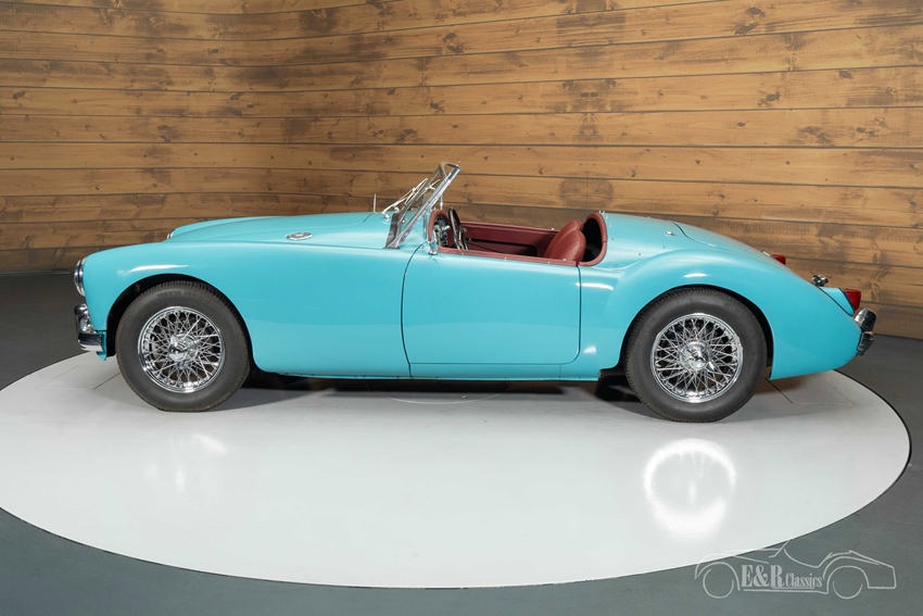 MG MGA Cabriolet in Glacier Blue te koop Qua uitstraling heeft deze MGA alles om indruk te maken. Hij is uitgevoerd in het stijlvolle en zeer zeldzame Glacier Blue lakwerk dat prachtig contrasteert met het bordeaux rode interieur. De chromen spaakwielen en de zwarte soft top met bijpassende zijraampjes geven de auto zijn kenmerkende klassieke uitstraling. Het interieur straalt Britse elegantie uit en vormt samen met het frisse exterieur een smaakvol geheel. Deze cabriolet is visueel een absolute blikvanger.