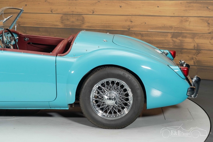 MG MGA Cabriolet in Glacier Blue te koop Qua uitstraling heeft deze MGA alles om indruk te maken. Hij is uitgevoerd in het stijlvolle en zeer zeldzame Glacier Blue lakwerk dat prachtig contrasteert met het bordeaux rode interieur. De chromen spaakwielen en de zwarte soft top met bijpassende zijraampjes geven de auto zijn kenmerkende klassieke uitstraling. Het interieur straalt Britse elegantie uit en vormt samen met het frisse exterieur een smaakvol geheel. Deze cabriolet is visueel een absolute blikvanger.
