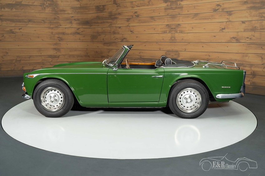 Groene Triumph TR250 te koop Deze Triumph is uitgevoerd in een groen lakwerk met hier en daar wat gebruikssporen dat perfect contrasteert met het sportieve zwarte interieur met witte piping. De kuipstoelen, het houten dashboard en het sportstuur versterken het Britse karakter. Details als de zwarte soft top, extra verstralers, stijlvolle chromen bumpers en het praktische kofferrek benadrukken de klassieke stijl. Een schitterende roadster om van te genieten tijdens zonnige ritten en oldtimer-evenementen.