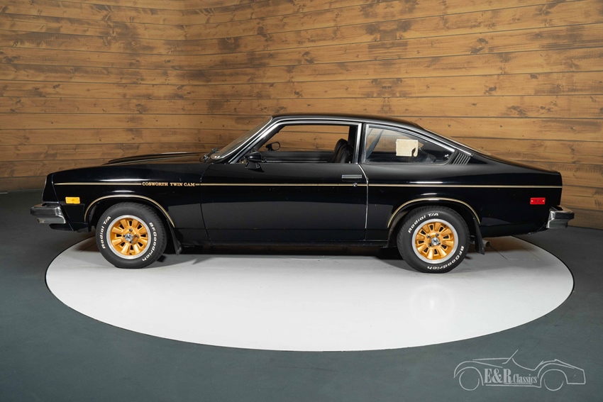 Chevrolet Cosworth Vega in zeer goede, originele staat te koop Qua uitstraling is deze Cosworth Vega een echte blikvanger. De diepzwarte lak combineert prachtig met de gouden striping en de originele goudkleurige aluminium velgen, een exclusieve afwerking die enkel aan deze uitvoering werd toegekend. Het sportieve interieur is volledig uitgevoerd in zwart lederlook met kenmerkend doorgestikte stoelen en een opvallend goudkleurig dashboard — een subtiele verwijzing naar zijn exclusieve karakter. Een bijzonder stijlvolle en authentieke presentatie van een auto die vandaag de dag zelden meer in deze staat wordt aangetroffen.