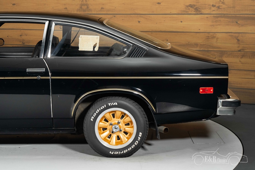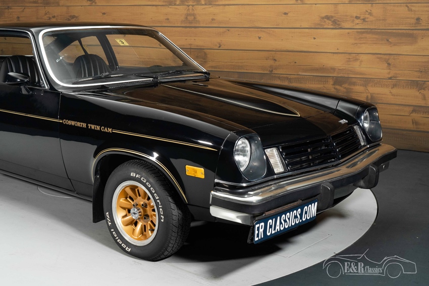 Chevrolet Cosworth Vega in zeer goede, originele staat te koop Qua uitstraling is deze Cosworth Vega een echte blikvanger. De diepzwarte lak combineert prachtig met de gouden striping en de originele goudkleurige aluminium velgen, een exclusieve afwerking die enkel aan deze uitvoering werd toegekend. Het sportieve interieur is volledig uitgevoerd in zwart lederlook met kenmerkend doorgestikte stoelen en een opvallend goudkleurig dashboard — een subtiele verwijzing naar zijn exclusieve karakter. Een bijzonder stijlvolle en authentieke presentatie van een auto die vandaag de dag zelden meer in deze staat wordt aangetroffen.