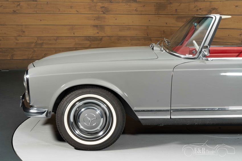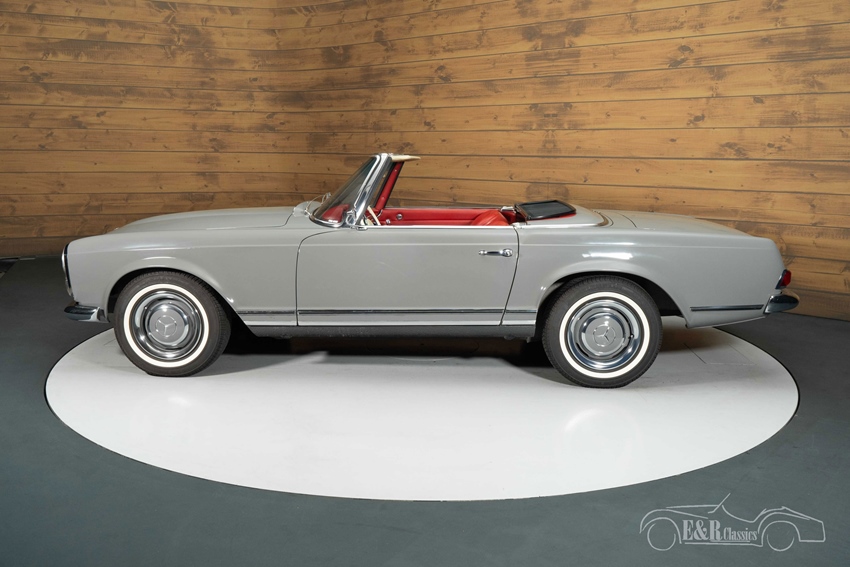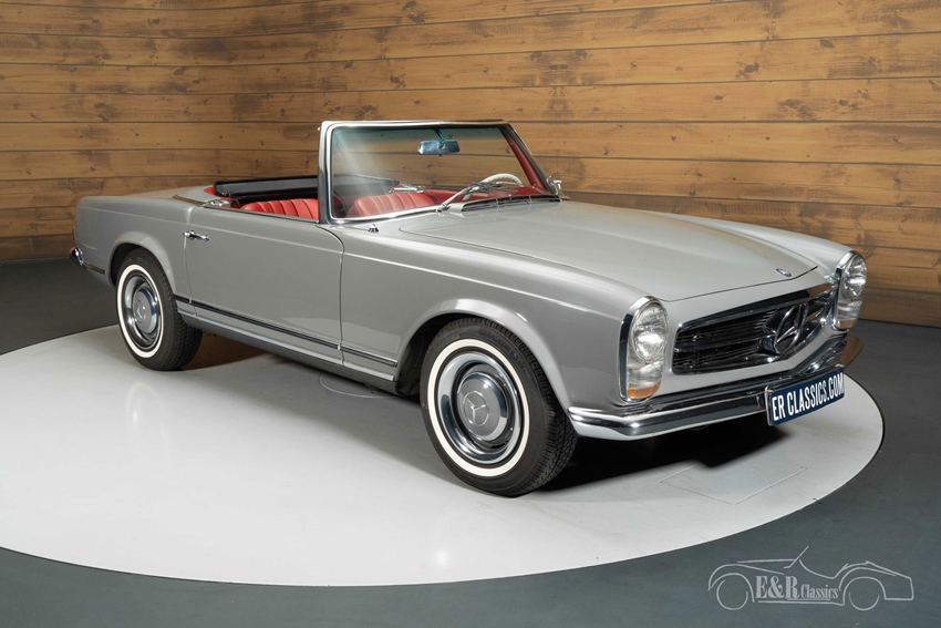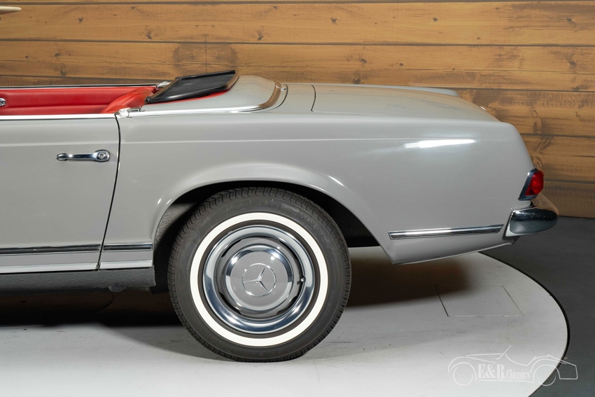 Mercedes-Benz 250 SL in Arabergrau te koop  De combinatie van de kleur Arabergrau (nr. 124) en het rode lederen interieur geeft deze Pagode een tijdloze en chique uitstraling. Het interieur straalt pure klasse uit met zijn originele chroomdetails, geperforeerd leder en zeldzame radio-afdekplaat met 250 SL-logo. De softtop en hardtop zijn beide aanwezig, net als een vernieuwd inox uitlaatsysteem, nieuwe Michelin whitewall-banden en een originele Frigiking-airco. Deze Mercedes-Benz is een schoolvoorbeeld van elegantie, authenticiteit en vakmanschap.