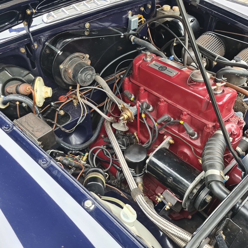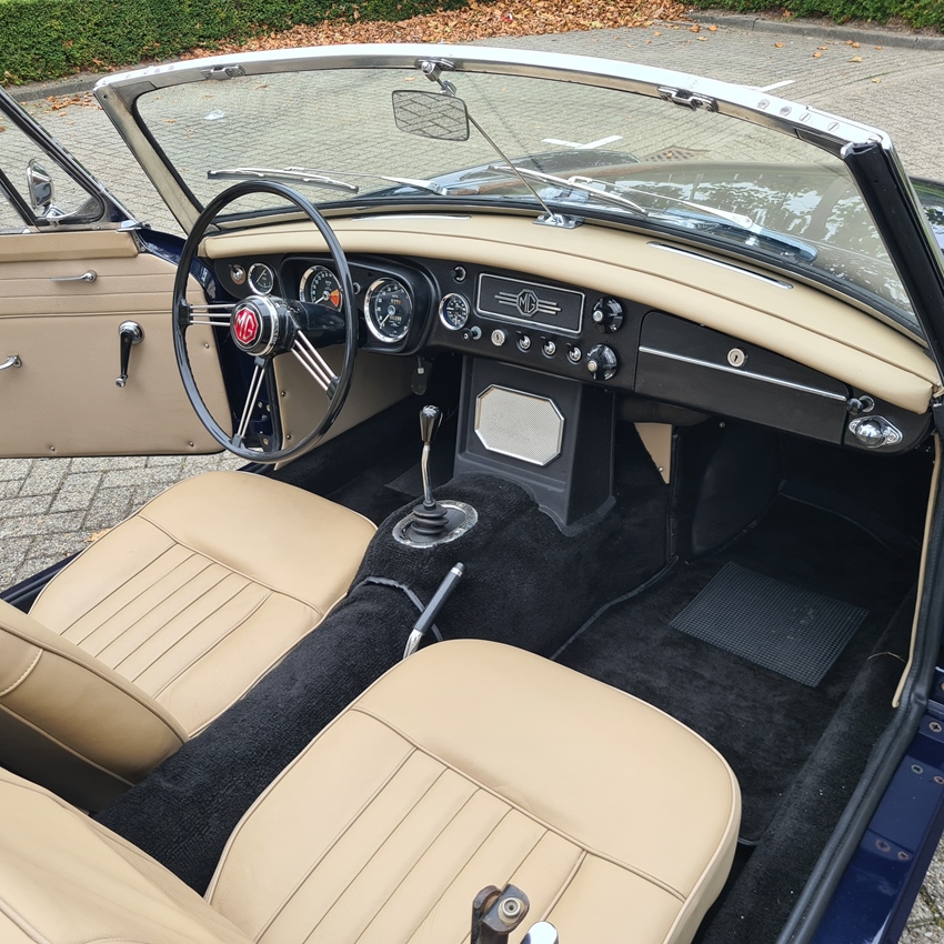 Een zeldzame kans voor de liefhebber! Deze beeldschone MGB uit 1963 schittert in de bijzondere kleur Midnight Blue en behoort tot de vroege modellen met het gewilde “lepeldeur”-type.