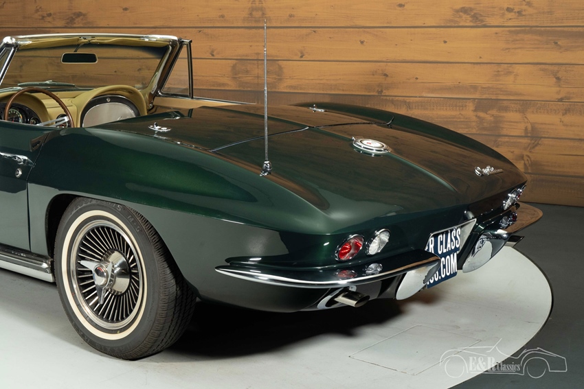 Chevrolet Corvette C2 Stingray Cabriolet in Glen Green Het exterieur van deze Corvette straalt klasse uit met zijn diepdonkergroene Glen Green lakwerk, perfect gecombineerd met een beigekleurige soft top en stijlvolle "Knock Off" wielen die het sportieve karakter benadrukken. Het luxe interieur is afgewerkt met beigekleurige bekleding, wat prachtig contrasteert met het exterieur en een warm, elegant geheel vormt. Authentieke details zoals de originele Delco AM/FM radio, houten stuurwiel en chromen accenten brengen de jaren zestig tot leven, terwijl het dashboard en tapijt in bijpassende tinten de harmonie van het interieur versterken.