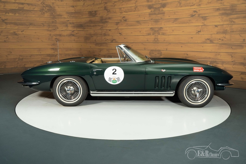 Chevrolet Corvette C2 Stingray Cabriolet in Glen Green Het exterieur van deze Corvette straalt klasse uit met zijn diepdonkergroene Glen Green lakwerk, perfect gecombineerd met een beigekleurige soft top en stijlvolle "Knock Off" wielen die het sportieve karakter benadrukken. Het luxe interieur is afgewerkt met beigekleurige bekleding, wat prachtig contrasteert met het exterieur en een warm, elegant geheel vormt. Authentieke details zoals de originele Delco AM/FM radio, houten stuurwiel en chromen accenten brengen de jaren zestig tot leven, terwijl het dashboard en tapijt in bijpassende tinten de harmonie van het interieur versterken.