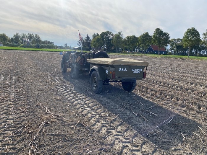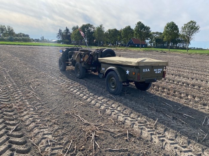 ALGEMEEN: Willys Jeep met aanhanger, een complete set inclusief aankleding. Het gaat om een Amerikaanse Willys uit bouwjaar 1947, voorzien van een Duitse Mercedes 200D dieselmotor. De auto heeft een Belgische registratie, waarbij ook diesel officieel op het kenteken staat vermeld. CARROSSERIE/LAKWERK: De carrosserie is in goede staat maar vertoont gebruikssporen zoals krassen en deuken. Het betreft een oudere restauratie. De auto wordt geleverd met huif, winterdeuren en halve deurtjes. De huif en deurtjes hebben wat beschadigingen, maar er is canvas aanwezig voor eventuele reparaties. TECHNISCH: Technisch verkeert de Jeep in goede staat en is voorzien van veel nieuwe onderdelen, waaronder remmen, olie en filters. De 4x4 aandrijving functioneert goed, inclusief hoge en lage gearing. INTERIEUR: Binnenin is de Jeep ingericht als WO2-tribute met veel originele details en onderdelen die teruggaan naar de oorlogsjaren. DOCUMENTEN: Belgisch kenteken aanwezig, geregistreerd als diesel. AFHALING: De auto kan bezichtigd en opgehaald worden in Bruinisse. Transport kan in overleg verzorgd worden. OVERIGE INFORMATIE: De set komt zeer compleet, zoals te zien op de foto's en video's, inclusief alle aankleding en extra (nieuwe) onderdelen. Zelden worden zulke complete exemplaren aangeboden. Video's: https://youtu.be/rTomHivpHrw?si=jM564zEpOs1vnCHX https://youtu.be/cFU_WqEMMWQ?si=86MRU0TLaOxvMBO