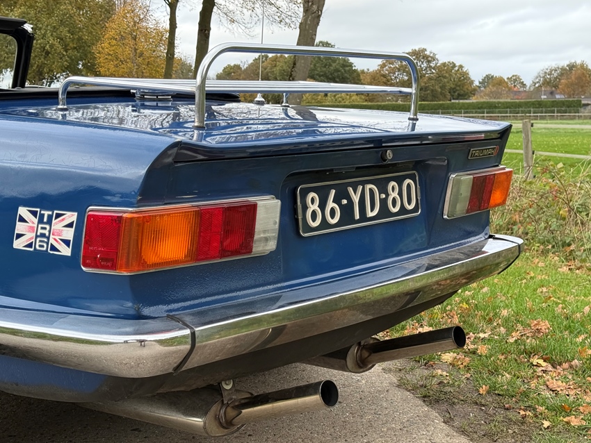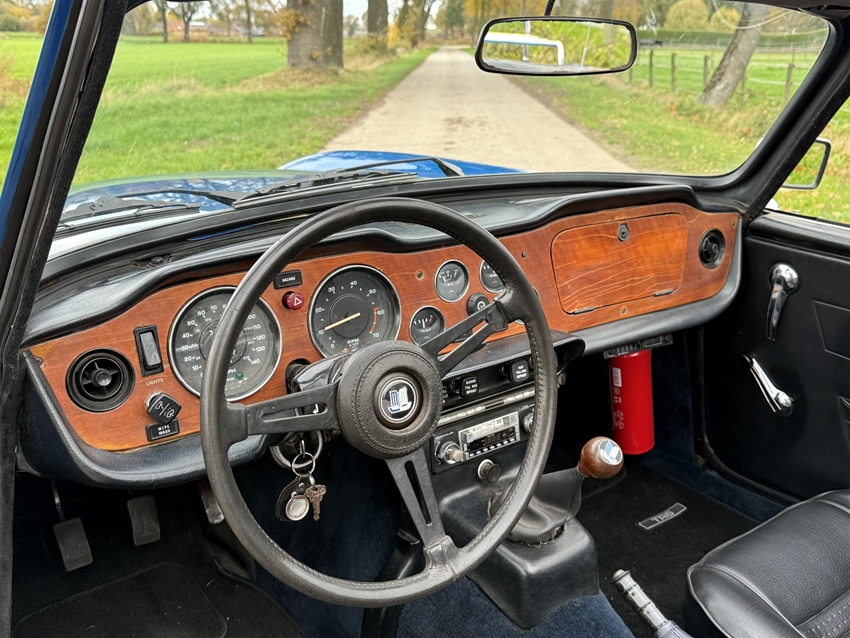 Deze gave TR6 bevindt zich in leuke 'rijdersstaat' gespoten in het mooie 'Royal Blue', met volledig nieuw interieur en cabriokap. De triple-Stromberg carburateurs zijn recent opnieuw afgesteld, en in combinatie met de RVS-sportuitlaat klinkt de 2.5-liter 6-in-lijn geweldig. Mocht je liever muziek luisteren ipv naar de uitlaat is dit ook mogelijk door de radio met ingebouwde speakers. De remmen zijn in orde, en de auto loopt en schakelt zuiver. De lak heeft aan de achterzijde wat leeftijds-eigenschappen, maar de voorzijde is erg netjes. Afgelopen week is de auto volledig gepolijst en gewaxt, en is deze dus helemaal klaar voor de mooie zonnige winterdagen.