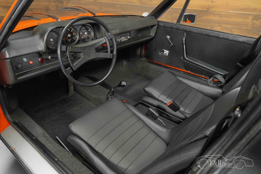 Porsche 914 Electric te koop Het oranjekleurige lakwerk geeft de 914 zijn iconische uitstraling, perfect in balans met de zwarte accenten en klassieke Fuchs stijl-velgen. Het afneembare dak maakt hem zowel sportief als praktisch, en het verzorgde zwarte interieur benadrukt de pure, functionele stijl waar Porsche in de jaren zeventig om bekendstond. Deze 914 Electric combineert tijdloze vormgeving met duurzame prestaties – een klassieker met toekomst.