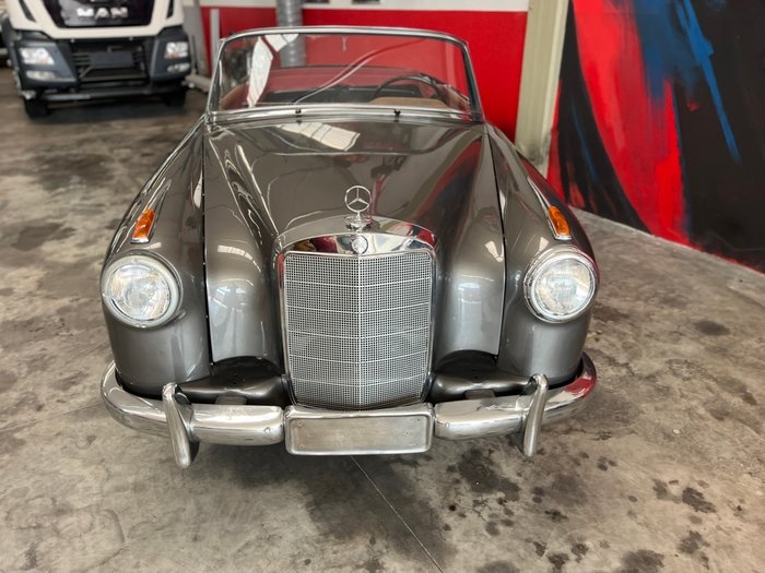 PANORAMISCH/VOORWAARDEN Mercedes 220 S Cabriolet uit 1957 De auto is voor het eerst ingeschreven in Zwitserland en bevindt zich sinds 1985 in Italië. De auto is momenteel ingeschreven in Italië. De restauratie van de auto is enkele jaren geleden begonnen en nooit voltooid door de vorige eigenaar. De carrosserie is gedemonteerd, gereinigd en volledig opnieuw gespoten. De interieurs zijn slechts gedeeltelijk afgewerkt. De stoelen zijn aanwezig, maar moeten worden herzien. Er ontbreken zeker enkele chromen profielen en de bekleding van de kap. De mechanica is gereviseerd, maar vereist controle en herstart, aangezien de motor al geruime tijd stil ligt. documentatie Een bijgevoegde Italiaanse documenten. Auto zichtbaar in Empoli, Italië.