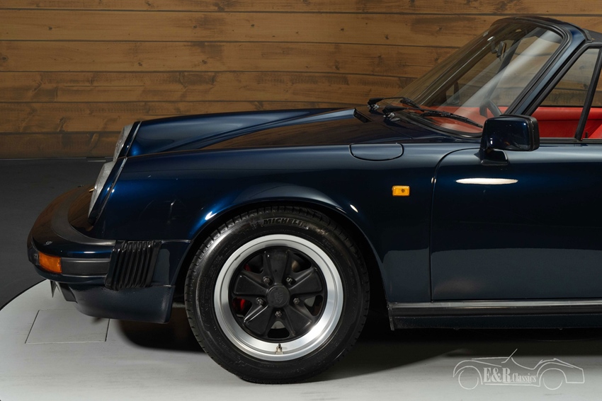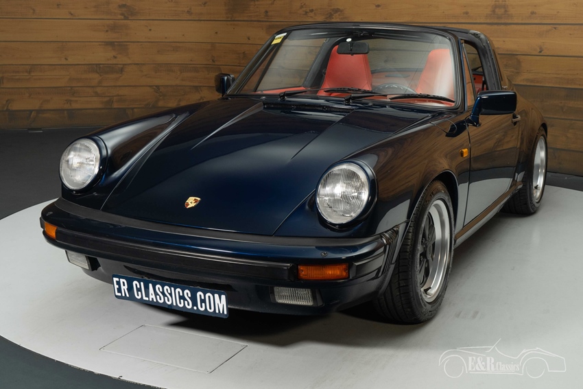 Porsche 911 Carrera Targa in Midnight Blue te koop Deze Porsche 911 Carrera Targa uit 1985 is uitgevoerd in de prachtige kleur Midnight Blue, een diepe blauwtint die schittert onder het licht en het iconische ontwerp extra kracht bijzet. De originele, zwartgelakte Fuchs-velgen geven de auto een extra sportieve uitstraling en passen perfect bij het contrastrijke uiterlijk. Het interieur van deze Targa is afgewerkt in levendig rood leer, dat prachtig combineert met de Midnight Blue-lak. De sportstoelen zijn comfortabel en bieden uitstekende ondersteuning, zowel bij ontspannen ritten als bij dynamisch rijden. Het dashboard en de deurpanelen zijn eveneens afgewerkt in rood leer, wat het interieur een luxueuze, maar ook gedurfde uitstraling geeft.