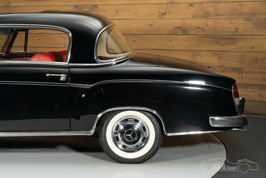 Zwarte Mercedes-Benz 220 S Ponton te koop Het uiterlijk is uitgevoerd in zwart lakwerk dat in 2004 opnieuw is aangebracht, met enkele lichte imperfecties die passen bij een auto van deze leeftijd. De combinatie met de whitewalls, originele wieldoppen en het klassieke schuifdak geeft de auto een tijdloze, luxe uitstraling. Het interieur is vernieuwd: rode bekleding, fraai gerestaureerd houtwerk inclusief dashboard en een nieuwe hemel creëren een warm, stijlvol samenspel met de donkere carrosserie. Deze 220 S Ponton is zowel optisch als technisch een bijzonder fraai exemplaar met veel liefde en zorg opgebouwd.