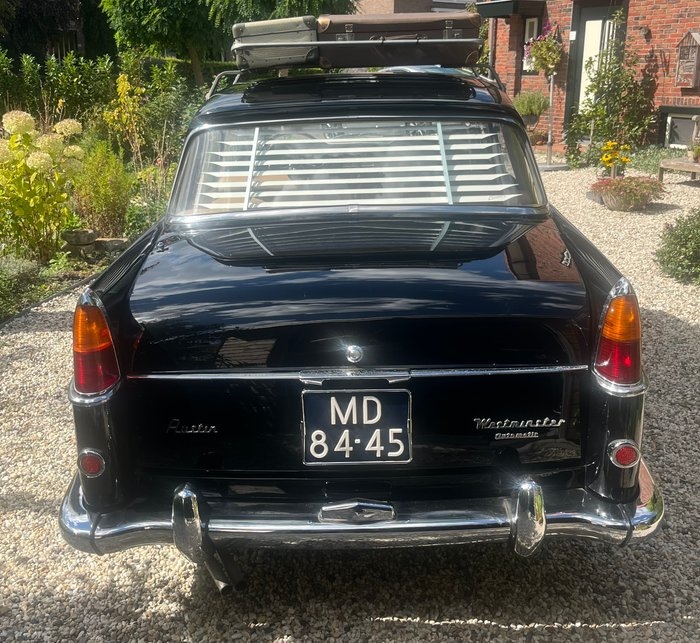 ALGEMEEN Deze origineel Nederlandse Austin Westminster A110 uit 1962 is uitgevoerd met een automatische transmissie en een krachtige drie liter zescilinder Austin-motor. Het betreft het grootste en meest luxueuze model binnen het Austin-programma. De auto is origineel in Nederland geleverd en beschikt nog over het oude Nederlandse kenteken. Dankzij zijn soepele automaat, comfortabele rijgedrag en voldoende vermogen is deze klassieke Austin uitstekend geschikt om ook in het huidige verkeer moeiteloos mee te rijden. CARROSSERIE & LAKWERK De carrosserie verkeert in zeer mooie conditie, zonder roestvorming of deuken. De auto is professioneel behandeld tegen roest door de firma Goslinga in Leeuwarden, wat de uitstekende conditie van het plaatwerk verklaart. Het lakwerk is zeer verzorgd en glanst fraai. De Austin is voorzien van nieuwe, originele chromen wielsierringen en Vredestein-banden met voldoende profiel. Verder is de auto uitgerust met een origineel jaren zestig imperiaal inclusief bijpassende koffers, een originele achterruitjaloezie, authentieke Lucas-lampen aan de voorzijde en een brandblusser uit dezelfde periode. TECHNISCH Technisch is de auto in zeer goede staat. De motor loopt mooi en krachtig, en de automaat schakelt soepel. In 2024 is de Austin volledig nagezien en heeft hij een groot onderhoudsbeurt gehad. Alle belangrijke onderdelen zijn gecontroleerd en waar nodig vernieuwd. De stuurbekrachtiging werkt naar behoren, al is er een lichte lekkage bij de pakking van de pomp. De auto rijdt stevig en comfortabel, met een verfijnde wegligging die past bij een luxe zescilinder sedan uit de jaren zestig. INTERIEUR Het interieur ademt pure Britse klasse. De stoelen zijn opnieuw bekleed met hoogwaardig leder, waarbij de voorstoelen zijn voorzien van nieuwe bekleding. De stoelen zitten zeer comfortabel, mede dankzij de dubbele armsteunen voorin. Alle meters en bedieningselementen op het dashboard functioneren volledig naar behoren. Het geheel verkeert in een verzorgde, originele staat die de sfeer van de jaren zestig prachtig behoudt. DOCUMENTEN Bij de auto wordt een uitgebreide documentatiemap geleverd met onder meer de originele handleiding en diverse historische gegevens over de Austin Westminster A110. Ook is aanwezig een officieel certificaat van het British Motor Industry Heritage Trust, getiteld Certified Copy of a Factory Record”. Hieruit blijkt dat de auto op 20 september 1962 is geproduceerd en op 25 september 1962 op transport is gegaan naar de Nederlandse Austin-importeur R.S. Stokvis & Zonen in Rotterdam. Deze firma, opgericht in 1849, was van 1937 tot 1970 de officiële importeur van Austin in Nederland. De eerste Nederlandse registratie vond plaats op 29 mei 1964. AFHALING De auto is rijklaar en kan in overleg worden afgehaald. De afhaallocatie is in Nederland; verdere afspraken over transport of levering kunnen in overleg worden gemaakt. OVERIGE INFORMATIE De Austin Westminster A110 die hier wordt aangeboden is een zeldzame verschijning, zeker in deze originele Nederlandse uitvoering en met een volledig gedocumenteerde historie. De auto combineert klassiek Britse elegantie met comfortabele rijeigenschappen en een indrukwekkende motor. Dankzij de originele accessoires uit de jaren zestig – zoals het imperiaal met koffers, de Lucas-lampen en de jaloezie – is dit exemplaar niet alleen technisch, maar ook visueel een unieke verschijning.