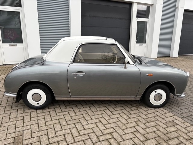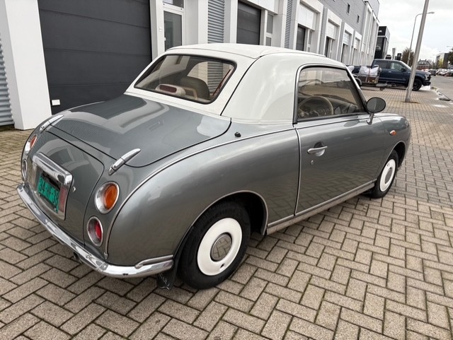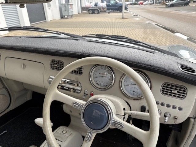 Wij hebben deze Figaro gevonden met schrale verschoten lak, met de verfroller gerold wit bovendeel, een dak dat niet helemaal goed gemonteerd is door een hobbyist, beschadigde wieldoppen, matige banden en wat achterstallig onderhoud. Dit alles hebben we gefixt, gelijk alle 22 modificaties er op los gelaten, de buitenkant voorzien van een nieuwe laklaag, net als het witte dakdeel, een nieuw vinyl dak en ook nieuw achterruitvinyl gemonteerd, het interieur vernieuwd met nette reconnolised leren stoelen en een nieuwe struisvogel leren dashboardtop.