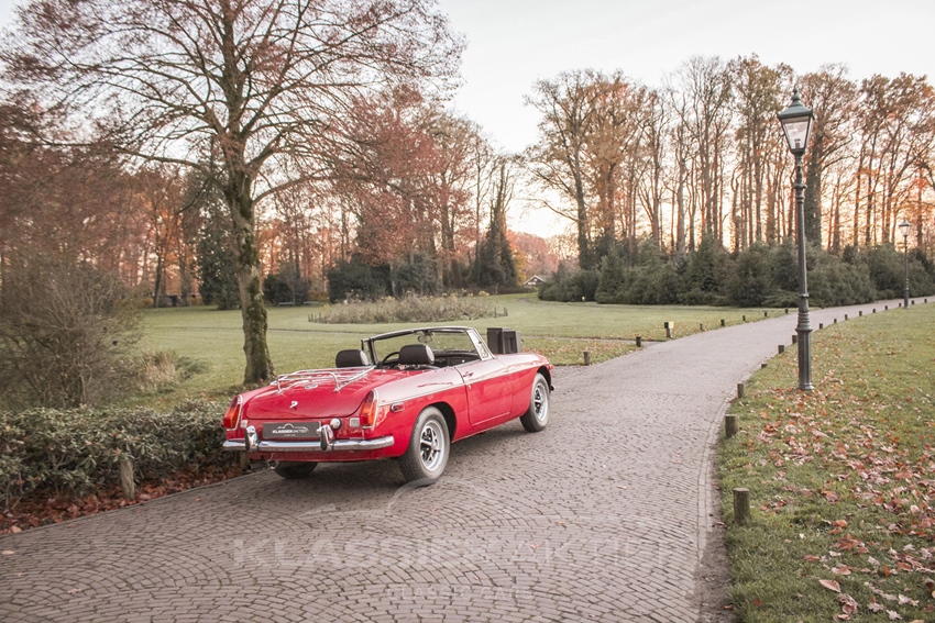 Deze prachtige rode MGB is met zeer veel liefde en zorg onderhouden. Dat is goed te zien aan de uitzonderlijk mooie en sublieme conditie van deze stijlvolle MGB. De carrosseriekleur heeft nog steeds een schitterende diepe glans en de verschillende chroom- en sierdelen zijn als nieuw. Ook de verschillende rubberdelen en afwerkingen zijn in perfecte conditie. Wat de auto ook erg aantrekkelijk maakt, is het feit dat de auto volledig origineel is gehouden. De schitterende originele rostyle velgen zijn een keer opnieuw gespoten en recent voorzien van nieuwe Michelin banden. De carrosseriedelen sluiten perfect op elkaar aan en de portieren sluiten degelijk en goed. Het mooie verchroomde kofferrek is niet alleen praktisch, maar ook een stijlvolle accessoire. De cabrioletkap is nog in zeer goede conditie.