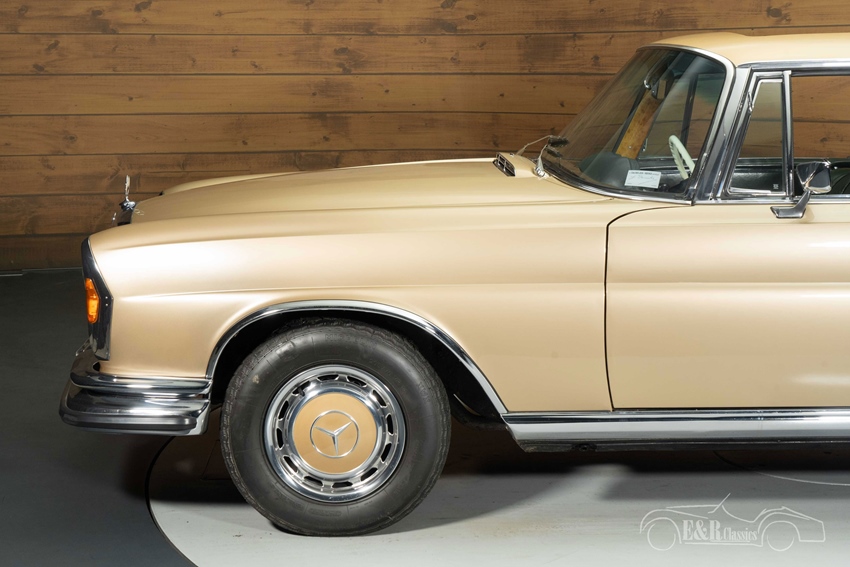 Mercedes-Benz 280 SE Coupe 3.5 in Tunis Beige te koop Ook qua uiterlijk laat deze coupé zien waarom hij wereldwijd zo gewild is. Het schitterende Tunis Beige metallic lakwerk sluit naadloos aan op de correcte wieldoppen en het elegante chroomwerk. Binnenin wacht een tijdcapsule: volledig origineel groen leder met een prachtige patina, bijpassende groene tapijten en sierlijk houtwerk dat de luxe sfeer versterkt. Het klassieke witte stuur, de Becker Mexico radio, de schuifdakoptie en de karakteristieke klokjes maken het interieur tot een toonbeeld van vakmanschap. Het totaalplaatje – de kleurcombinatie, de staat, de details en de exclusieve uitvoering – maakt dit één van de meest onderscheidende 280 SE 3.5 Coupés die momenteel op de markt zijn.