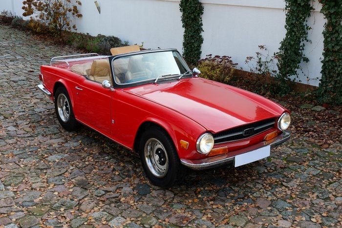 ALGEMEEN: Deze Triumph TR6 onderging in 2017 een uitgebreide professionele restauratie en verkeert sindsdien in uitstekende staat. Afgewerkt in Classic Pimento Red, wordt hij geleverd met het zeldzame bijpassende vaste dak en een softtop in beige. De auto is recentelijk onderhouden in oktober 2025 en is volledig klaar voor direct gebruik. Hij is uitgerust met elektronische ontsteking, een nieuwe dynamo en gerenoveerde bedrading, evenals een nieuw kleppendeksel met pakking en een nieuwe carburateurkap. De motor trekt krachtig, de auto is betrouwbaar en klaar om meteen van te genieten. Carrosserie en lakwerk: Het carrosserie is in 2017 volledig gerestaureerd en verkeert tot op heden in zeer goede staat. De lak ziet er uitstekend uit, met slechts enkele kleine imperfecties die zichtbaar zijn in de galerij. De passing van de panelen is uitstekend en alle deuren, motorkap en koffer openen en sluiten soepel. De vloer is volledig roestvrij en is behandeld met hoogwaardige anti-corrosiebescherming, waardoor de auto een solide en goed bewaarde uitstraling heeft. { Mechanisch gezien verkeert deze TR6 in uitstekende staat. De motor levert volle kracht, de remmen werken krachtig en voorspelbaar, en zowel de vering als de gewenste 4-versnellingsbak functioneren precies zoals ze behoren. Recent technisch werk omvat elektronische ontsteking, een nieuwe dynamo, vernieuwde bedrading, een nieuw kleppendeksel en pakking, en een nieuwe carburateurkap. De auto kreeg in maart 2025 een oliewissel en in oktober 2025 een volledige service, waardoor verdere aandacht niet nodig is. INTERIEUR: Het interieur is volledig gerenoveerd tijdens de restauratie in 2017 en verkeert nog steeds in uitstekende staat. Het beschikt over opnieuw beklede bruin lederen bekleding met geüpgradede hoge rugleuning stoelen met hoofdsteunen. De zwarte tapijten in de cabine en kofferbak zijn ook in zeer goede staat. De cabine oogt overal schoon en heeft verder niets nodig. Documenten: De TR6 werd oorspronkelijk geleverd in Frankrijk en wordt nog steeds geleverd met de originele Franse registratiepapieren. De restauratie is uitgevoerd in Frankrijk voordat de auto werd gekocht bij ER Classics in Nederland en vervolgens geïmporteerd naar Polen. Recentelijk heeft de auto de Poolse technische keuring doorstaan. De auto wordt geleverd met twee sleutels, het bijpassende hardtop, softtop en soft-top cover, evenals de handleiding van de fabriek. Ophalen De auto is volledig klaar voor afhaling en kan direct worden gereden. Dankzij de recente onderhoudsbeurt en de geldige technische keuring kan de nieuwe eigenaar meteen de weg op zonder verdere voorbereiding. ANDERE INFORMATIE: Deze Triumph TR6 is een zeer goed onderhouden exemplaar, dat profiteert van een grondige restauratie, een zeldzame kleur en topcombinatie, en uitstekende mechanische staat. Met zijn Franse herkomst, volledige documentatie, recente onderhoudsbeurten en de aanwezigheid van zowel hard- als softtops, valt hij op als een aantrekkelijke keuze voor liefhebbers en verzamelaars.