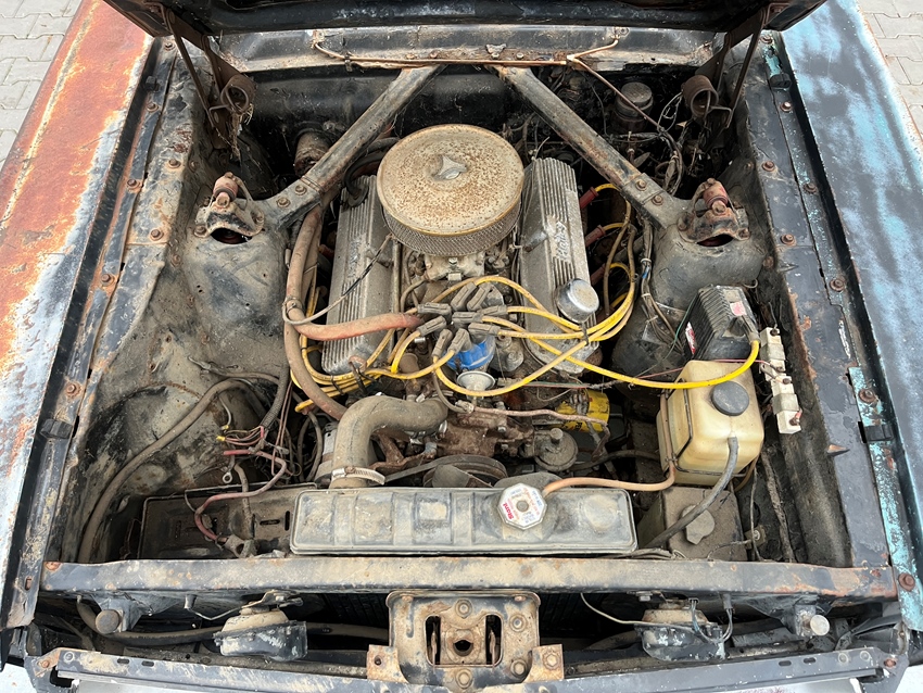 Af fabriek geleverd met 200 ci zes-in-lijn en handgeschakelde versnellingsbak, later omgebouwd naar een 289 V8 met automatische transmissie. Motor draait met de hand rond. Olie is schoon, recent ogend oliefilter aanwezig. Voorzien van Holley aluminium kleppendeksels en elektronische ontsteking.