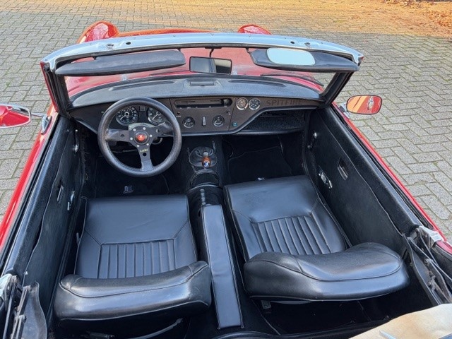Deze Spitfire is een fantastische rijdersauto, hij ziet er prachtig uit, een mooie klassieker uit de jaren 70. Het lakwerk is zeer netjes, de rode kleur oogt bijzonder fris en sportief, vooral in combinatie met de zwarte bekleding en softtop. Er zijn een paar kleine imperfecties, maar niets ernstigs. De auto heeft een bijzonder fraaie uitstraling. Het interieur is zeer netjes, de stoelen zijn net volledig opnieuw bekleed en voorzien van nieuw schuim, de deurpanelen en de vloerbedekking zijn allemaal uitgevoerd in hetzelfde bijpassende zwart. De softtop is genaakt van zwart vinyl. Deze versie heeft het zeldzame zwarte dashboard, dat er fantastisch uitziet in combinatie met het sportieve stuurwiel. Ook onder de motorkap is alles in uitstekende staat en de auto is perfect onderhouden; het onderhoud is altijd uitgevoerd bij een specialist in klassieke auto's in Zuid-Nederland. De techniek is in perfecte staat. De motor en versnellingsbak zijn in perfecte conditie. De auto heeft net zijn jaarlijkse onderhoudsbeurt gehad, dus nieuwe olie, filter, bougies, etc. Het chassis is zeer solide en roestvrij. De zeldzame lichtmetalen ally cat velgen passen perfect bij deze klassieke en sportieve Triumph, zoals het hoort. Wie gaat er zorgeloos genieten van deze schoonheid uit de jaren 70?
