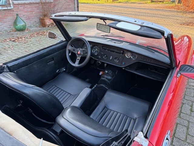 This Spitfire is a great drivers car, it has a neat appearance, a beautiful 70's classic. The paintwork is very neat, the red color looks particularly fresh and sporty, especially in combination with the black upholstery and soft top. It has a few minor imperfections but nothing major. The car is a particularly nice appearance. The interior is very neat, the seats are just fully new upholstered and got new foams fitted, the door panels and carpetset are all equipped in the same matching black. The soft top is equipped in black vinyl. This version has the rare black dashboard , it looks fantastic together with the sporty steering wheel. It is just as fresh under the bonnet and superb maintained, the car always had its maintenance at a classic car specialist in the south of Holland. The technology is in excellent order. The engine and gearbox are in perfect condition. The car just had its yearly maintenance, so new oil, filter, sparkplugs,etc. The chassis is very solid and rust-free. The period correct and rare ally cat wheels fit this classic and sporty Triumph perfectly, as it should. Who will enjoy this 70's beauty carefree ?