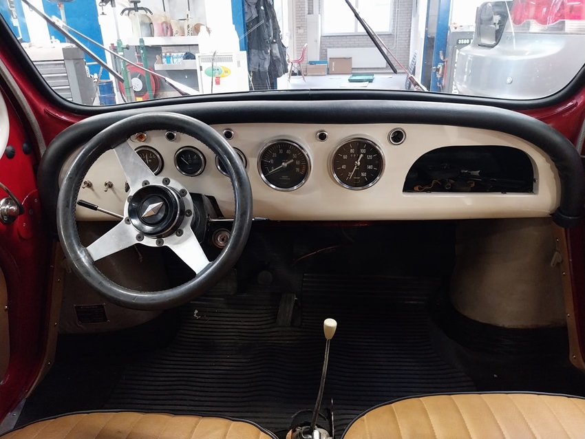 Interieur > Het dashboard en het interieur is volledig vernieuwd. In het instrumentarium zijn de meters terug te vinden van een Renault 8. Het stoffen dak is handgemaakt door een specialist.