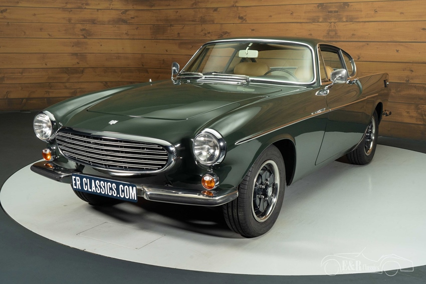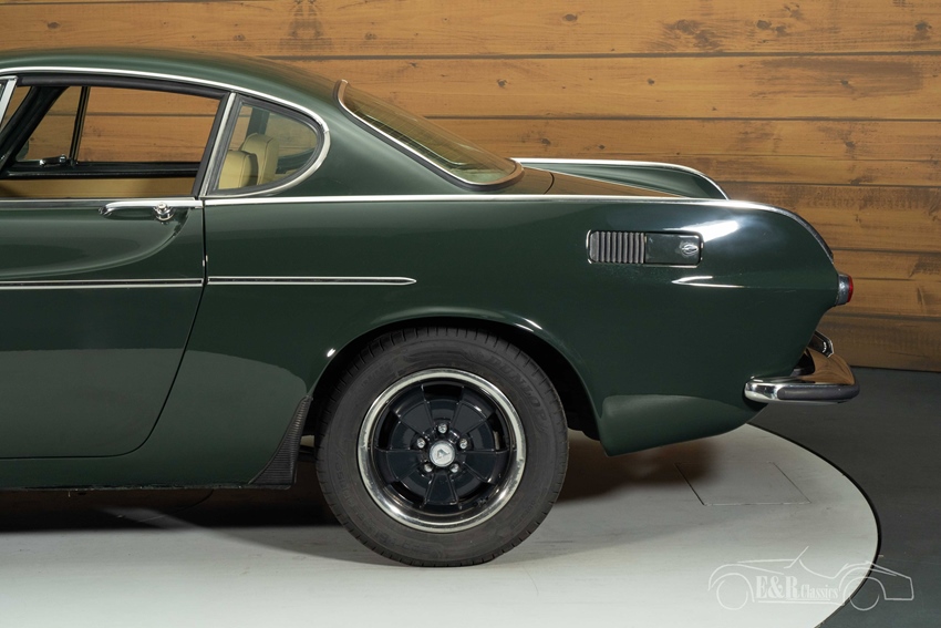 Donkergroene Volvo P1800 E te koop Het exterieur is uitgevoerd in stijlvol donkergroen lakwerk dat de elegante lijnen van de P1800 prachtig benadrukt. In combinatie met de klassieke Minilite-stijl lichtmetalen velgen oogt de auto sportief en period-correct. Het interieur is afgewerkt in een warm bruin kleurenschema, dat mooi contrasteert met het exterieur en zorgt voor een chique, klassieke uitstraling. De prachtige bekleding, het karakteristieke dashboard en de harmonie tussen lakwerk en interieur maken deze Volvo tot een bijzonder aantrekkelijke klassieker voor de echte liefhebber.