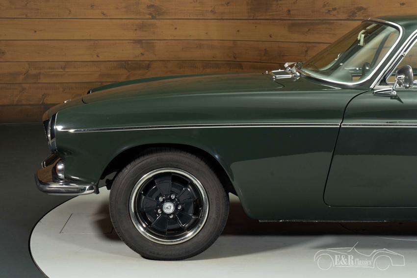 Donkergroene Volvo P1800 E te koop Het exterieur is uitgevoerd in stijlvol donkergroen lakwerk dat de elegante lijnen van de P1800 prachtig benadrukt. In combinatie met de klassieke Minilite-stijl lichtmetalen velgen oogt de auto sportief en period-correct. Het interieur is afgewerkt in een warm bruin kleurenschema, dat mooi contrasteert met het exterieur en zorgt voor een chique, klassieke uitstraling. De prachtige bekleding, het karakteristieke dashboard en de harmonie tussen lakwerk en interieur maken deze Volvo tot een bijzonder aantrekkelijke klassieker voor de echte liefhebber.