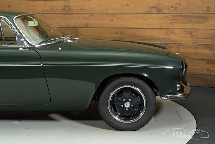 Donkergroene Volvo P1800 E te koop Het exterieur is uitgevoerd in stijlvol donkergroen lakwerk dat de elegante lijnen van de P1800 prachtig benadrukt. In combinatie met de klassieke Minilite-stijl lichtmetalen velgen oogt de auto sportief en period-correct. Het interieur is afgewerkt in een warm bruin kleurenschema, dat mooi contrasteert met het exterieur en zorgt voor een chique, klassieke uitstraling. De prachtige bekleding, het karakteristieke dashboard en de harmonie tussen lakwerk en interieur maken deze Volvo tot een bijzonder aantrekkelijke klassieker voor de echte liefhebber.