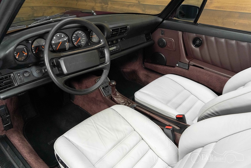 Porsche 911 Carrera 4 Cabriolet in Porsche Amethyst metallic Het uiterlijk is bijzonder stijlvol dankzij het zeldzame Porsche Amethyst metallic lakwerk, dat perfect combineert met de zwarte Mohair soft top. De klassieke Cup-velgen benadrukken het sportieve karakter en passen naadloos bij de tijdloze lijnen van de 964. Het interieur is uitgevoerd in grijs leder met paars tapijt, een opvallende en smaakvolle combinatie die mooi aansluit bij de carrosseriekleur. Daarnaast is deze Porsche voorzien van airconditioning, elektrisch verstelbare en verwarmbare stoelen en een moderne Continental DAB radio, waardoor comfort en originaliteit hand in hand gaan. Een cabriolet die zowel visueel als technisch indruk maakt en klaar is om van te genieten.