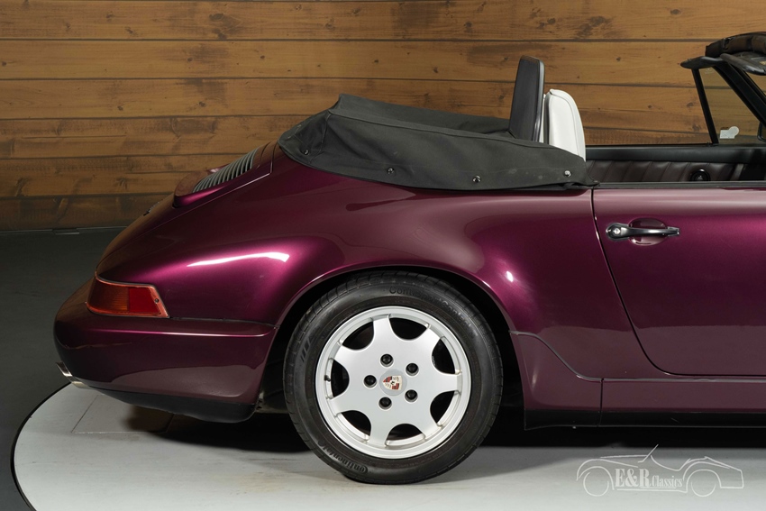 Porsche 911 Carrera 4 Cabriolet in Porsche Amethyst metallic Het uiterlijk is bijzonder stijlvol dankzij het zeldzame Porsche Amethyst metallic lakwerk, dat perfect combineert met de zwarte Mohair soft top. De klassieke Cup-velgen benadrukken het sportieve karakter en passen naadloos bij de tijdloze lijnen van de 964. Het interieur is uitgevoerd in grijs leder met paars tapijt, een opvallende en smaakvolle combinatie die mooi aansluit bij de carrosseriekleur. Daarnaast is deze Porsche voorzien van airconditioning, elektrisch verstelbare en verwarmbare stoelen en een moderne Continental DAB radio, waardoor comfort en originaliteit hand in hand gaan. Een cabriolet die zowel visueel als technisch indruk maakt en klaar is om van te genieten.
