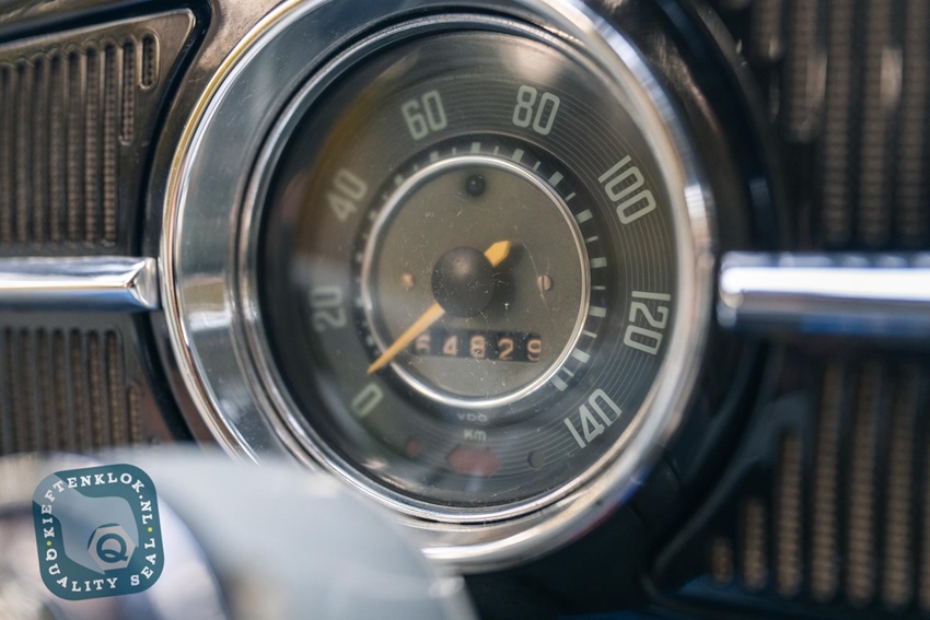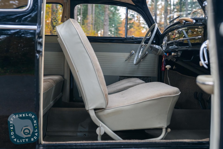 Het chassis en de onderzijde van de kachelkanalen verkeren in bijzonder nette staat. Binnenin vind je nog het volledig originele interieur: stoelen, tapijt, matten en hemel – allemaal zoals in 1961 geleverd. Natuurlijk zijn er gebruikssporen, maar dat hoort bij de charme van een auto met authentiek patina.