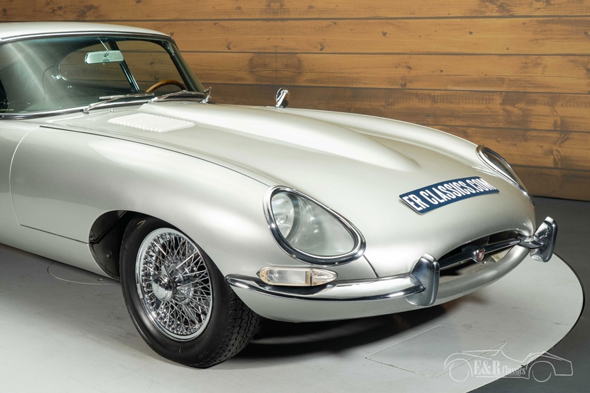 Zilvergrijs metallic Jaguar E-Type Series 1 Coupe te koop Het exterieur van deze E-Type Series 1 is uitgevoerd in stijlvol zilvergrijs metallic lakwerk, dat perfect aansluit bij de elegante lijnen van de E-Type. De klassieke Series 1 koplampen en achterlichten onderstrepen het tijdloze karakter, terwijl de chromen spaakwielen zorgen voor een authentieke en luxe uitstraling. Ook het interieur is geheel in lijn met het exterieur: een zwart lederen interieur dat fraai contrasteert met het koetswerk en een sportieve, maar comfortabele ambiance creëert. Stuurbekrachtiging verhoogt het rijcomfort, zonder afbreuk te doen aan het klassieke gevoel. Het samenspel tussen kleurstelling, materialen en details maakt deze Jaguar tot een indrukwekkende verschijning, zowel rijdend als stilstaand.