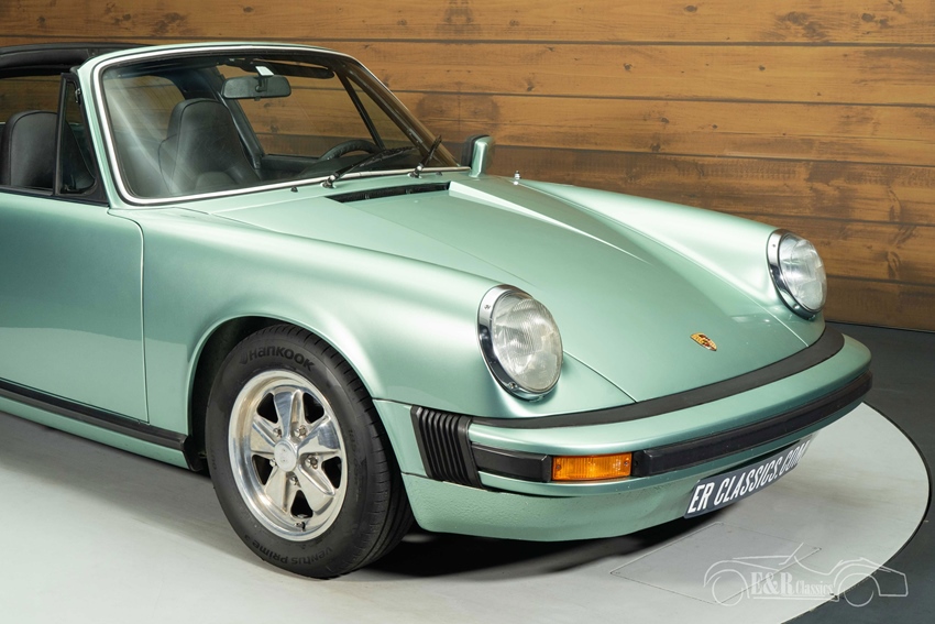 Porsche 911 S Targa in Ice Green Metallic te koop Het exterieur is uitgevoerd in het zeldzame Ice Green Metallic lakwerk, een kleur die perfect past bij de elegante lijnen van de 911 en prachtig contrasteert met de zwarte Targa-rolbeugel. De klassieke Fuchs velgen onderstrepen het sportieve en authentieke karakter van de auto. Binnenin beschikt deze Porsche over een zwart interieur dat klasse en functionaliteit uitstraalt, met kenmerkende sportstoelen en het vertrouwde vijfklokken-dashboard. Het samenspel tussen het frisse lakwerk en het donkere interieur zorgt voor een tijdloze, stijlvolle uitstraling die deze 911 S Targa tot een echte blikvanger maakt.