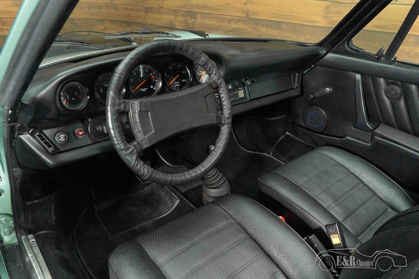 Porsche 911 S Targa in Ice Green Metallic te koop Het exterieur is uitgevoerd in het zeldzame Ice Green Metallic lakwerk, een kleur die perfect past bij de elegante lijnen van de 911 en prachtig contrasteert met de zwarte Targa-rolbeugel. De klassieke Fuchs velgen onderstrepen het sportieve en authentieke karakter van de auto. Binnenin beschikt deze Porsche over een zwart interieur dat klasse en functionaliteit uitstraalt, met kenmerkende sportstoelen en het vertrouwde vijfklokken-dashboard. Het samenspel tussen het frisse lakwerk en het donkere interieur zorgt voor een tijdloze, stijlvolle uitstraling die deze 911 S Targa tot een echte blikvanger maakt.
