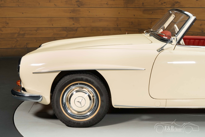 Beigekleurige Mercedes-Benz 190 SL te koop Het exterieur is uitgevoerd in stijlvol beigekleurig lakwerk, dat perfect past bij de tijdloze vormgeving van de 190 SL. De zwarte soft top vormt een fraai contrast en maakt de auto geschikt voor zowel open als gesloten rijden. Het interieur is afgewerkt met een bordeauxrood lederen interieur, wat samen met het lichte exterieur zorgt voor een bijzonder chique uitstraling. De klassieke details, het overzichtelijke dashboard en de hoogwaardige materialen benadrukken het luxe karakter waarvoor Mercedes-Benz in deze periode bekendstond.