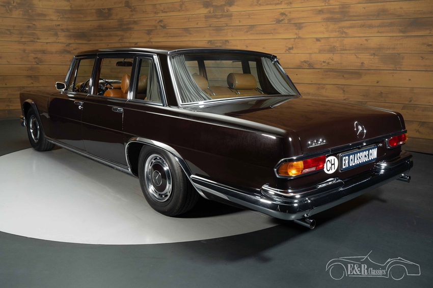 Donkerbruine Mercedes-Benz 600 te koop Ook uiterlijk en interieur ademen exclusiviteit. Het diepe, donkerbruine lakwerk combineert prachtig met de klassieke lijnen en originele Mercedes wieldoppen. Binnenin wordt u verwelkomd door een luxueus lederen interieur in cognac/tan, rijk afgewerkt met wortelnotenhout fineer. Het centrale hogedruk-hydraulische systeem bedient ramen, stoelen en portieren, inclusief hydraulische soft-close portieren, terwijl de originele airconditioning zorgt voor extra comfort. Verder is de auto uitgerust met een Sennheiser (Senn Sound) audio-bedieningsunit en een originele Becker Grand Prix radio. Privacygordijnen in het achtercompartiment maken het geheel compleet en benadrukken het statige, representatieve karakter van deze Mercedes-Benz.