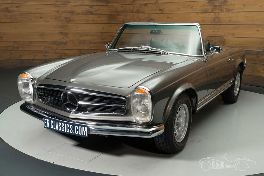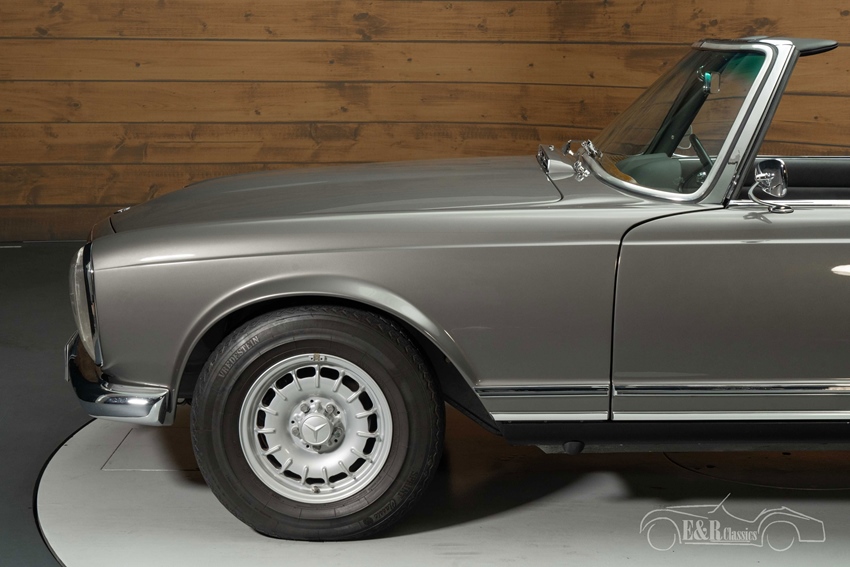 Handgeschakelde Mercedes-Benz 280 SL Pagode in concoursstaat te koop Zoals u op de foto’s kunt zien, zijn er kosten noch moeite gespaard om een zeer goed exemplaar van deze Pagode te maken. De restauratie is van een zeer hoog niveau en dat is er aan af te zien. De Mercedes-Benz 280 SL is uitgevoerd in een prachtig antracietkleurig lakwerk dat erg mooi combineert met alle chromen accessoires en de kroonkurk velgen. Het zwarte lederen interieur verkeert in een zeer goede staat en maakt er samen met het antraciet lakwerk en de zwarte soft top een prachtig geheel van. Het dashboard beschikt over chromen tellers, houtbekleding en een Becker Europa radio. Kortom: een zeer compleet uitgeruste Mercedes-Benz 280 SL in zeer goede staat die helemaal klaar is voor zijn nieuwe eigenaar.