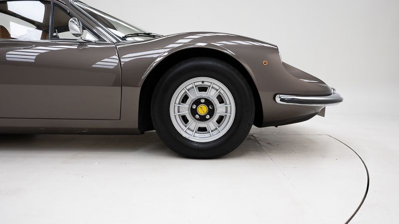 Het tijdloze koetswerk van Pininfarina wordt algemeen beschouwd als één van de mooiste sportwagenontwerpen aller tijden. De vloeiende lijnen, compacte proporties en perfecte visuele spanning maken de Dino 246 GT tot een designicoon dat losstaat van trends of tijdperken. In deze specifieke uitvoering wordt dat karakter nog versterkt door de uiterst zeldzame Marrone Dino Metallizzato-kleur, waarvan slechts een zeer beperkt aantal exemplaren werd geproduceerd.