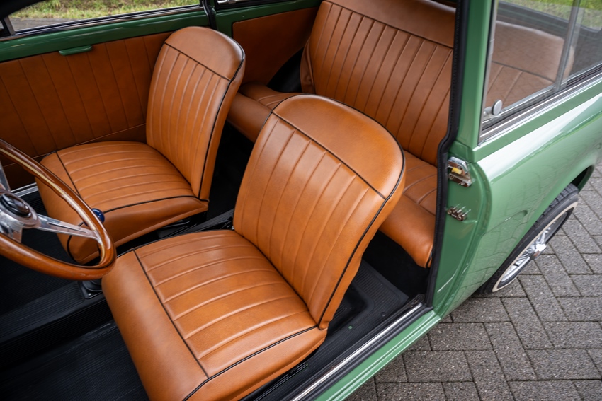 Interieur met frisse bekleding, helder instrumentarium en fraai Nardi-hout