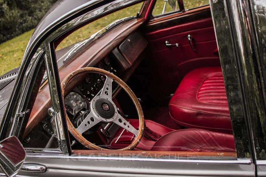 Oorspronkelijk is deze, in 1967 geproduceerde Jaguar MK2 340 geleverd in het Verenigd Koninkrijk en in 1993 in Nederland gekomen. Bij deze auto zijn ook verschillende historische documenten aanwezig, zowel uit Engeland als uit Nederland. De Jaguar MK2 is voorzien van een stijlvolle middengrijs metallic met prachtig rood lederen interieur. Wat ons betreft, de perfecte kleurencombinatie. De carrosserie is in redelijk goede conditie, al zijn er op verschillende plekken wel ouderdomssporen te zien. Ook het chroomwerk is over het algemeen in redelijk goede conditie en er zijn op een aantal chroom- en sierdelen ouderdomssporen zichtbaar. Dit is ook van toepassing op de verschillende rubberdelen en afwerkingen. De stijlvolle spaakvelgen vormen een prachtige combinatie bij deze schitterende carrosseriekleur.