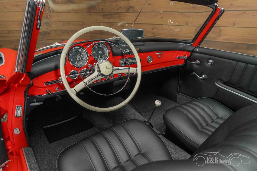 Mercedes-Benz 190 SL in concoursstaat te koop Het rode lakwerk geeft deze Mercedes-Benz een krachtige en stijlvolle uitstraling die perfect contrasteert met de zwarte soft top en bijbehorende cover. De klassieke whitewalls en originele stalen velgen met wieldoppen versterken het authentieke karakter van deze roadster. Het zwart lederen interieur sluit naadloos aan bij het exterieur en verkeert in een sublieme staat. Het fraaie dashboard met klassieke klokken, het ivoorkleurige stuurwiel, Becker Europa radio en de verfijnde details ademen pure jaren ’60 klasse. Alles aan deze 190 SL straalt vakmanschap en exclusiviteit uit – een unieke kans voor de verzamelaar of liefhebber die op zoek is naar een top gerestaureerde klassieker.