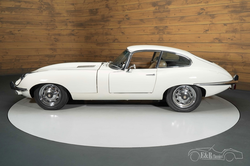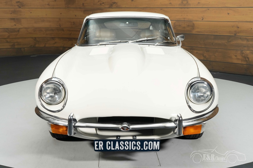 Jaguar E-Type Series 2 Coupe in Old English White te koop Het Old English White lakwerk benadrukt de elegante, gespierde lijnen van de Series 2 en combineert mooi met de chroomaccenten en klassieke wielen. Binnenin vormt het bruine interieur een warm en stijlvol contrast, met het typische Jaguar-dashboard en de sportieve, lage zitpositie. Het geheel oogt verzorgd en tijdloos, waardoor deze E-Type zowel in de showroom als op de weg een overtuigende uitstraling heeft.