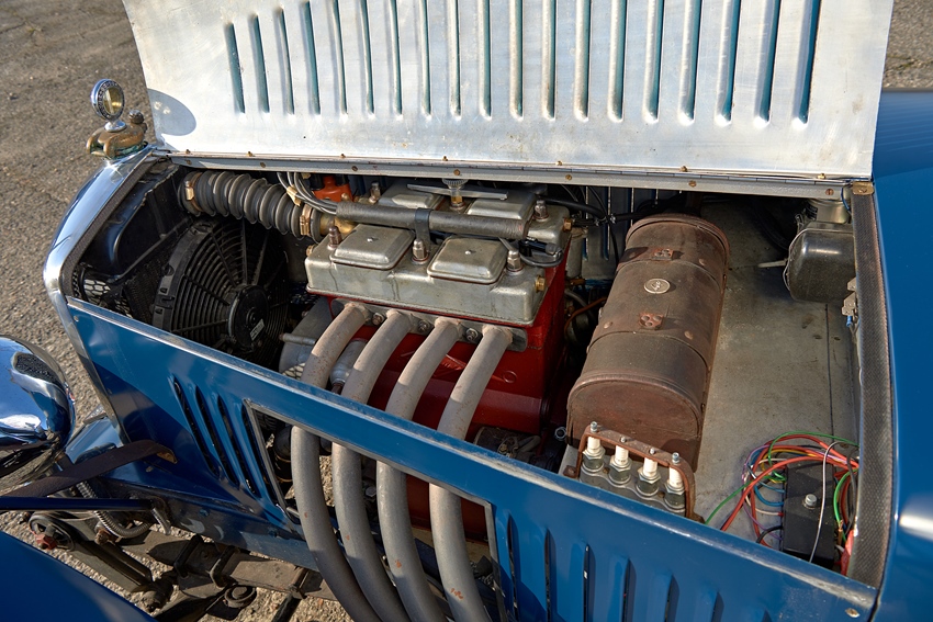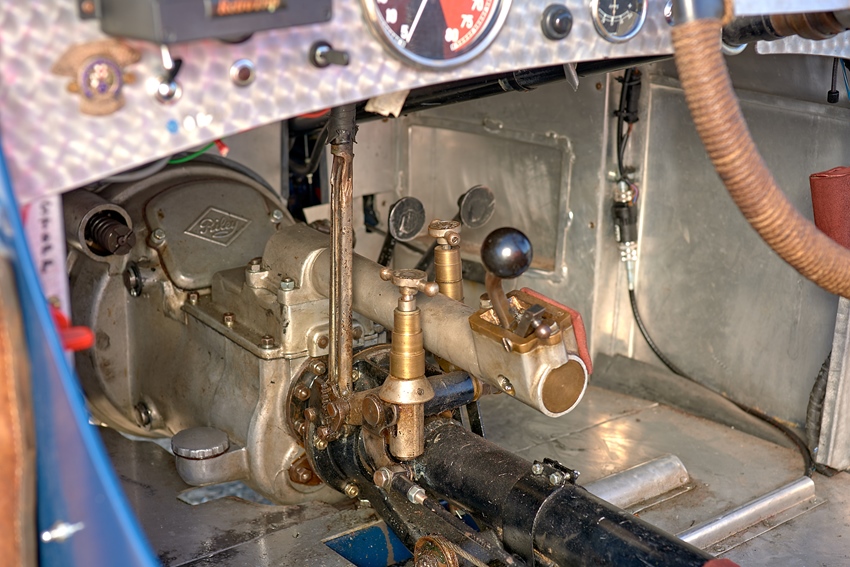 De auto verkeert in goede staat. De carrosserie is gemaakt van lichtgewicht aluminium op het originele chassis en afgewerkt in een opvallende blauwe kleur met suède stoelen in roodbruin.