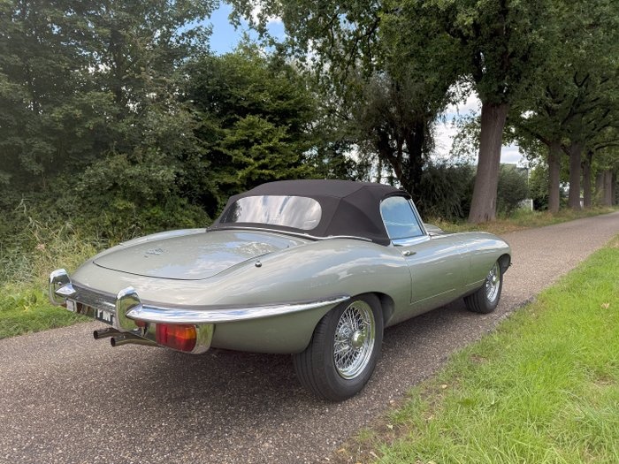Deze Jaguar E-Type 4.2L Series 2 cabriolet (OTS) uit 1970 is een zorgvuldig gerestaureerd exemplaar in een zeer nette staat. Een klassieker met een sterke uitstraling. Een aantrekkelijk en compleet exemplaar voor de liefhebber. Carrosserie en lakwerk De auto is volledig nuts-and-bolts gerestaureerd en verkeert in een verzorgde, nette conditie. De carrosserie is strak en de lak in Opalescent Silver Grey heeft een diepe glans. Het chroomwerk is in verzorgde staat en de auto is uitgerust met recent vernieuwde chromen spaakwielen, compleet met nieuwe banden rondom. Technische staat De 4.2-liter zes-in-lijn motor loopt soepel en krachtig. De versnellingsbak schakelt prettig en remmen, ophanging en stuurinrichting functioneren zoals verwacht van een goed onderhouden E-Type. De auto beschikt over matching numbers en een afgelezen tellerstand van 87.989 mijl. Voorzien van een Nederlands kenteken en rijklaar. Staat van het interieur Het interieur is opnieuw bekleed in hoogwaardig zwart leder en verkeert in zeer nette staat. De afwerking is verzorgd en uitgevoerd met aandacht voor originaliteit. De zwarte mohair soft-top sluit goed aan en is eveneens in uitstekende conditie. Documentatie De auto wordt geleverd met onderstaande documenten: - Nederlandse registratie papieren - Heritage Certificate - Een uitgebreide fotoreportage van de restauratie - Originele gereedschapset Overige informatie: Het is raadzaam om het voertuig eerst te bekijken alvorens te bieden om teleurstellingen achteraf te voorkomen. Voor een afspraak kunt u contact opnemen met Catawiki. Transport is geen probleem; vraag naar de mogelijkheden.