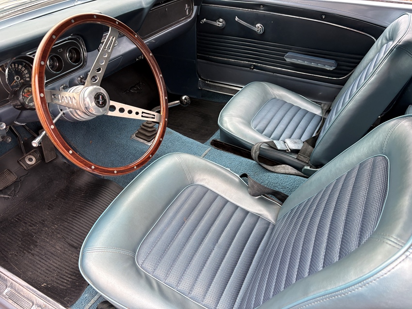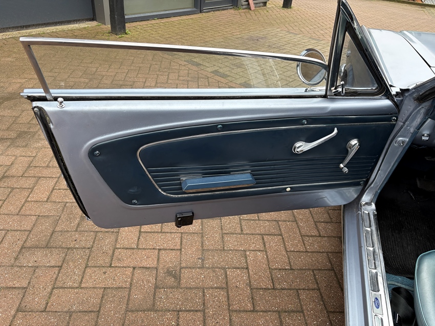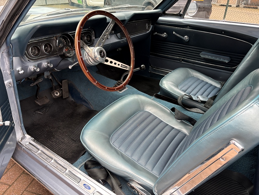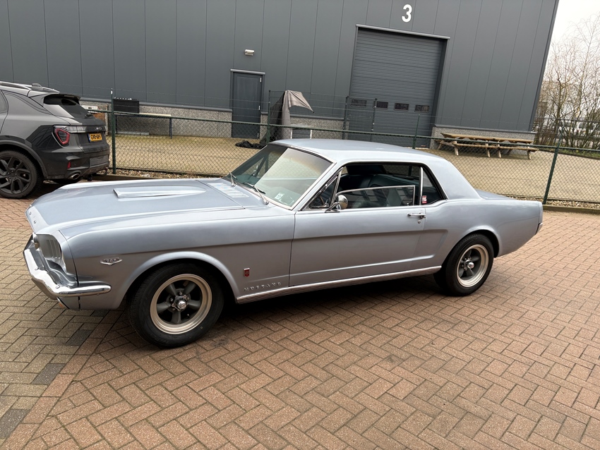 Deze Ford Mustang coupé met Nederlands kenteken uit 1966 werd oorspronkelijk geleverd met de lakkleur Nightmist Blue, een blauw interieur en een C-code 289ci V8 gecombineerd met een handgeschakelde drieversnellingsbak. Recentelijk werd de auto opnieuw gespoten in een lichtere tint en werd de motor gereviseerd met gesmede zuigers. De auto is verder uitgerust met grilleverlichting in GT-stijl en een dubbel uitlaatsysteem dat via de achterspoiler naar buiten komt, samen met een Edelbrock carburateur en inlaatspruitstuk, 15-inch American Racing Torq Thrust velgen, een motorkap scoop, moderne koplampen, een Monte Carlo bar, schijfremmen vóór en een radio met retro-look. RDW gekeurd op 24-02-2026. Dit is een mooie auto die als daily driver gebruikt kan worden, maar ook vermogen genoeg heeft om eens een keer lekker gas te geven. Kom gerust langs om deze beauty te bekijken (op afspraak). Een autoinspectie is uiteraard mogelijk, een hefbrug is aanwezig.