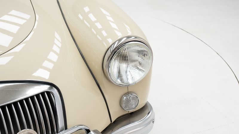 Dit exemplaar uit 1957 werd in het verleden professioneel gerestaureerd en presenteert zich volgens onze inspectie in een goede staat. De wagen komt in een stijlvolle beige kleurstelling en behoudt het authentieke karakter van deze klassieke Britse sportwagen.
