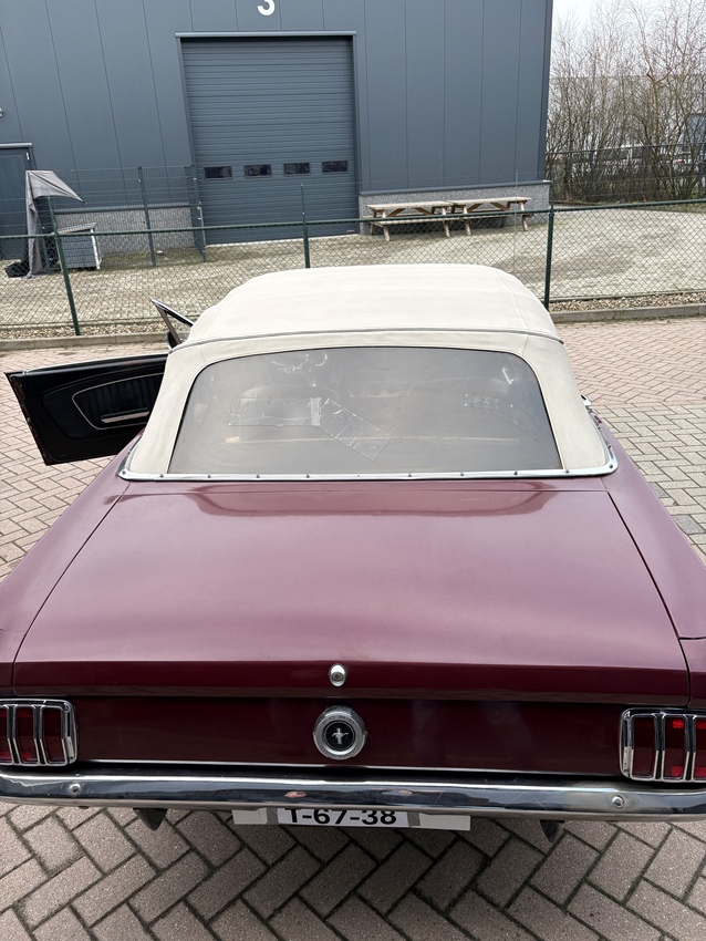 Deze Ford Mustang convertible uit 1965 met Nederlands kenteken stond tot 2020 33 jaar lang in de stalling. Hij is uitgevoerd in Vintage Burgundy met een zwart interieur en wordt aangedreven door een 200ci 6-cilinder motor, gecombineerd met een handgeschakelde 3-bak. De trommelremmen zijn gereviseerd en de auto heeft spaakwieldoppen, een witte softtop met 2 scheuren in het vinyl raam en een retro-look radio. De auto is uiterlijk niet perfect, maar heeft een heerlijke klassieke look. De 14-inch stalen velgen zijn voorzien van wieldoppen en banden met witte strepen. De auto heeft zwarte bekleding op de kuipstoelen en er is een radio met retro-look geïnstalleerd. De auto heeft een door de dealer geïnstalleerde airconditioning, maar deze werkt niet. Het instrumentarium bestaat uit een snelheidsmeter van 193 km/u, geflankeerd door meters voor het brandstofniveau en de koelvloeistoftemperatuur. De vijfcijferige kilometerteller geeft 46.158 Miles aan. De 200ci 6-cilinder had een fabrieksvermogen van 120 pk, dat via een handgeschakelde 3-bak en een achteras met een overbrengingsverhouding van 3,20:1 naar de achterwielen wordt gestuurd. De afgelopen vijf jaar is de radiator vervangen, de koppeling, verdeler, contactpunten, uitlaat en brandstofpomp vervangen. Recent is nog vervangen: Remleidingen, achterremmen, stuurkogels, stuurarmen. RDW goedgekeurd op 13-02-2026