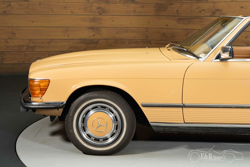 Mercedes-Benz 450 SL in unieke kleurstelling te koop Wat deze Mercedes-Benz 450 SL onderscheidt van de rest is toch wel zijn unieke kleurstelling. De klassieker is uitgevoerd in een prachtig lichtbruin lakwerk dat samen met de donkerbruine mohair soft top en het bruine interieur zorgt voor een unieke en zeer smaakvolle combinatie. De oldtimer is tevens voorzien van de originele, klassieke stijl gespoten wieldoppen die het geheel helemaal afmaken. Het interieur verkeert in een nette staat en beschikt over climate control zodat u tijdens een warme zomerdag heerlijk kunt genieten van een koel briesje tijdens het toeren.