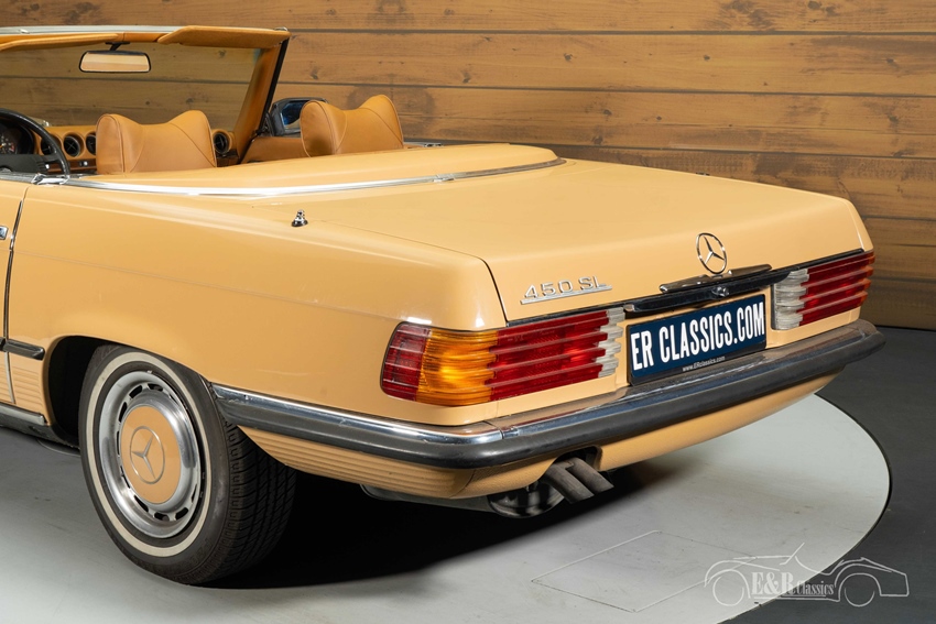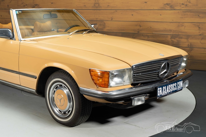 Mercedes-Benz 450 SL in unieke kleurstelling te koop Wat deze Mercedes-Benz 450 SL onderscheidt van de rest is toch wel zijn unieke kleurstelling. De klassieker is uitgevoerd in een prachtig lichtbruin lakwerk dat samen met de donkerbruine mohair soft top en het bruine interieur zorgt voor een unieke en zeer smaakvolle combinatie. De oldtimer is tevens voorzien van de originele, klassieke stijl gespoten wieldoppen die het geheel helemaal afmaken. Het interieur verkeert in een nette staat en beschikt over climate control zodat u tijdens een warme zomerdag heerlijk kunt genieten van een koel briesje tijdens het toeren.