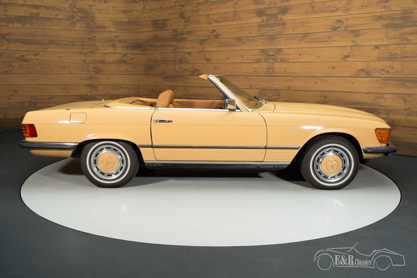 Mercedes-Benz 450 SL in unieke kleurstelling te koop Wat deze Mercedes-Benz 450 SL onderscheidt van de rest is toch wel zijn unieke kleurstelling. De klassieker is uitgevoerd in een prachtig lichtbruin lakwerk dat samen met de donkerbruine mohair soft top en het bruine interieur zorgt voor een unieke en zeer smaakvolle combinatie. De oldtimer is tevens voorzien van de originele, klassieke stijl gespoten wieldoppen die het geheel helemaal afmaken. Het interieur verkeert in een nette staat en beschikt over climate control zodat u tijdens een warme zomerdag heerlijk kunt genieten van een koel briesje tijdens het toeren.